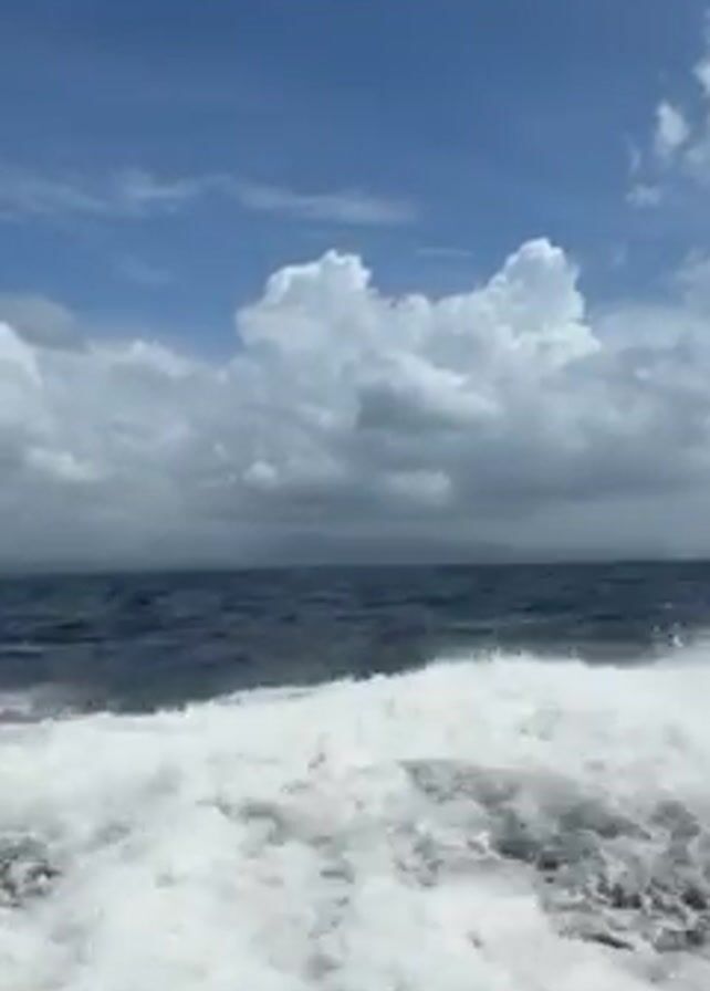view from a moving boat on the ocean. The water is a dark blue, and white waves are churned up by the boat's movement. In the distance, land is visible. The sky is partly cloudy with a mix of white, puffy clouds and darker, gray clouds. The overall impression is of a boat trip on a sunny, but potentially stormy day.
