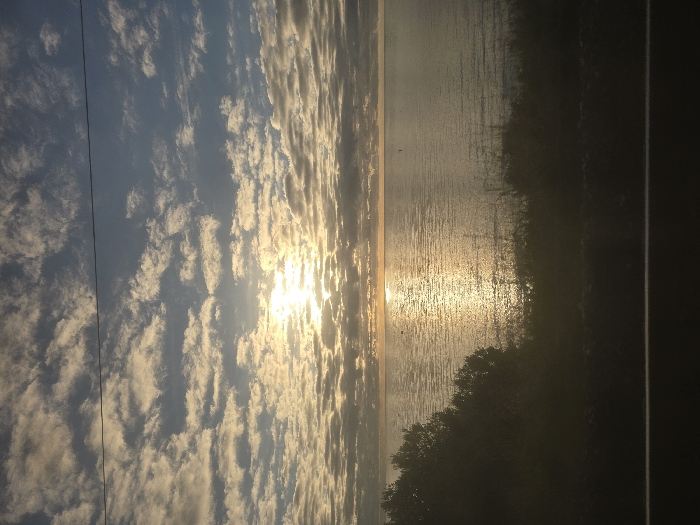The image depicts a sunrise or sunset over the Mediterranean Sea, viewed from a coastal location in Èze, France. The sun is positioned low on the horizon, partially obscured by scattered altocumulus clouds, casting a prominent golden-yellow reflection path across the calm, rippled water surface. The sky transitions from a light blue at the zenith to warmer golden and white tones near the horizon, with clouds distributed throughout. A thin, dark linear object, consistent with a utility cable, stretches across the upper portion of the sky. Two small, dark, unidentified objects are visible on the water's surface in the mid-distance. The immediate foreground is heavily shadowed, revealing a dense band of dark green coastal vegetation, including trees and bushes, silhouetted against the bright sea and sky. A dark, horizontal linear element, consistent with a road or barrier, occupies the bottom edge of the frame. No people or specific interactions are discernible.