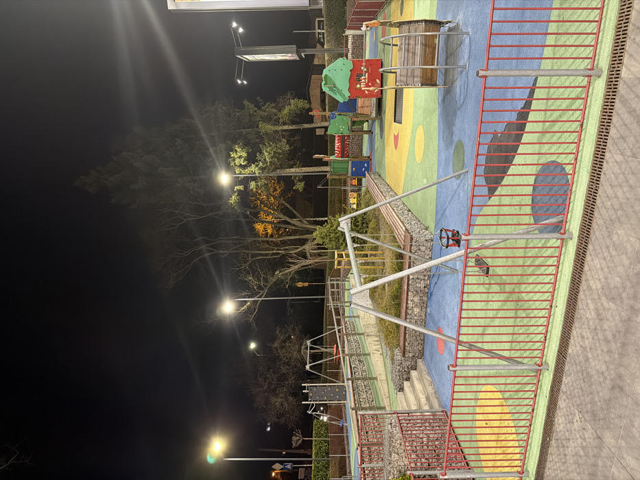 This image depicts an unoccupied outdoor children's playground at night in Ivanyane, Bulgaria