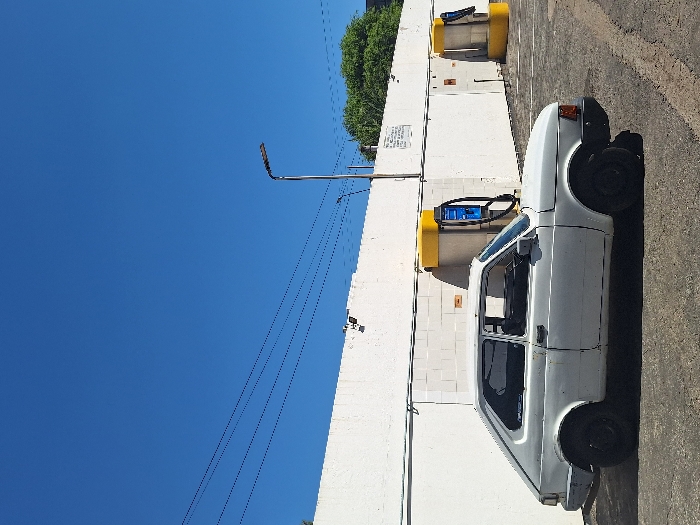 A white, boxy car is parked next to a white building with yellow, gas pump-like structures attached. The car's windows are open. A tall street lamp extends into a clear blue sky. Power lines run from the building. The ground is a cracked concrete surface. Part of the building is covered in green foliage.