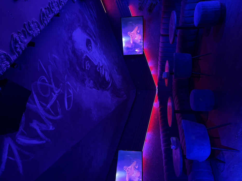 A dimly lit interior space with blue and red lighting. On the left, a wall features a dark painting of a face with graffiti-like white scribbles below. Two screens mounted on the wall show figures in vibrant colours. The right side of the scene shows a cushioned wall with circular details, and several modern blue stools with black legs.