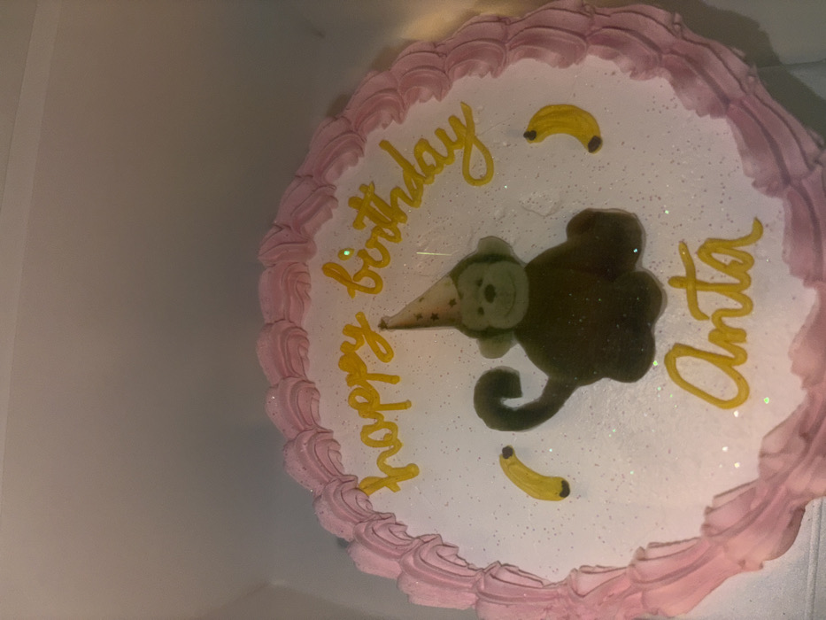 A circular white birthday cake, adorned with pink ruffled frosting around its perimeter, is depicted in an indoor setting within San Bernardino Tlaxcalancingo, Mexico. The cake's surface is lightly dusted with glitter. Centered on the cake is a dark brown monkey figure wearing a light-colored conical party hat with multi-colored stars. Two yellow banana decorations are placed on either side of the monkey. Yellow script icing spells out "happy birthday" across the top half of the cake and "Anta" across the bottom half. The cake appears to be positioned inside a light-colored, possibly white, box or against a plain light wall, with direct lighting from above creating a slight reflection.