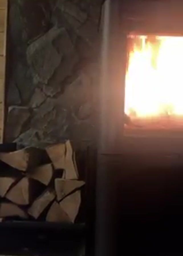 A static medium shot shows a modern, black wood-burning stove, with a clear glass door, burning brightly inside