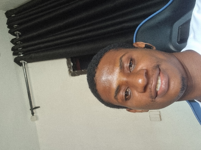 An indoor portrait depicts an adult male of African descent, positioned centrally, facing forward with a slight smile. He has short dark hair, a faint mustache, and a short beard, and is wearing a white crew-neck t-shirt. A black wireless earbud is visible in his right ear. To the subject's left, a light-colored wall features a double light switch or electrical outlet cover. To the subject's right and behind him, a dark, possibly black, pleated curtain hangs from a silver-toned curtain rod with a decorative end cap. A portion of a window frame or wall opening is visible beneath the curtain. A black gaming chair with blue trim is partially visible to the right of the subject. The image lacks specific visual identifiers to confirm a precise location within the city of Enugu, Nigeria.