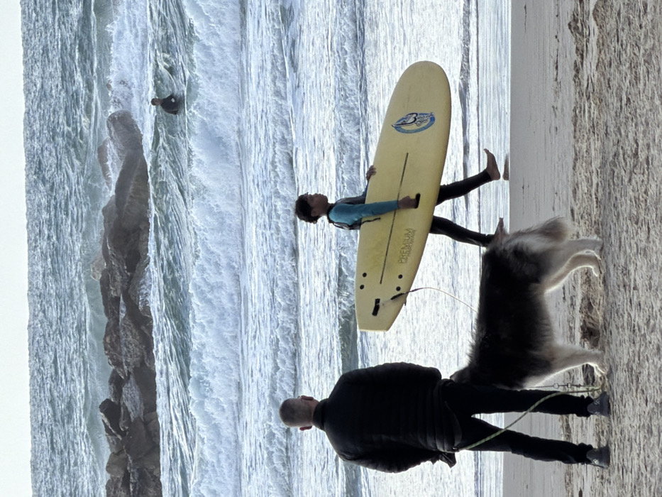 A forensic examination of the image reveals a dynamic beach scene on the Mediterranean coast, consistent with a location such as Tel-Aviv, Israel, specifically identifiable by the characteristic rock breakwaters in the background. The foreground depicts an adult male, seen from behind, wearing a dark puffer jacket and dark pants. He stands on wet sand, holding a lime-green leash connected to a large, fluffy black and white dog, possibly an Alaskan Malamute, positioned beside him. Both are oriented towards the sea. In the mid-ground, a young individual, likely a child or teenager, walks barefoot from right to left along the waterline. This individual possesses dark, curly hair and wears a two-tone wetsuit, with a lighter blue upper portion and dark lower portion. They are carrying a yellow surfboard, branded "PREMIUM," under their left arm, with a leash trailing from the board. The background features the sea with significant wave action. A dark rock breakwater extends horizontally across the frame in the mid-distance, with waves breaking against and over it. Further to the right in the water, a solitary individual in a dark wetsuit is partially submerged, appearing to await waves. The sky is overcast, providing diffused lighting across the entire scene.