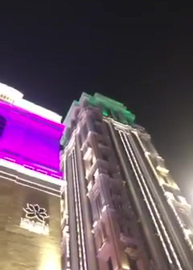 tall building at night, illuminated by bright lights. The upper part of the building has green lights, and there's another building adjacent to it illuminated with pink lights. The buildings are ornate and appear to be made of stone or a similar material. The sky is dark, indicating it is nighttime. The camera angle is low, looking up at the structures.