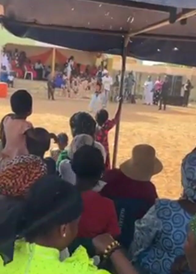 Here's a concise description of the video: The video shows an outdoor event, possibly a celebration or ceremony, taking place in an open area. A crowd of people, mostly women, are seated or standing under a temporary shelter with a black tarp overhead. They are watching a man in a white hat and light clothing dance with a child in front of a stage. The stage has a backdrop of orange and yellow fabric. More people are seated on the stage, including children in matching outfits. The ground is sandy or dirt. Some people are waving or raising their hands in the air. There is a speaker and some equipment visible on the right side of the stage.