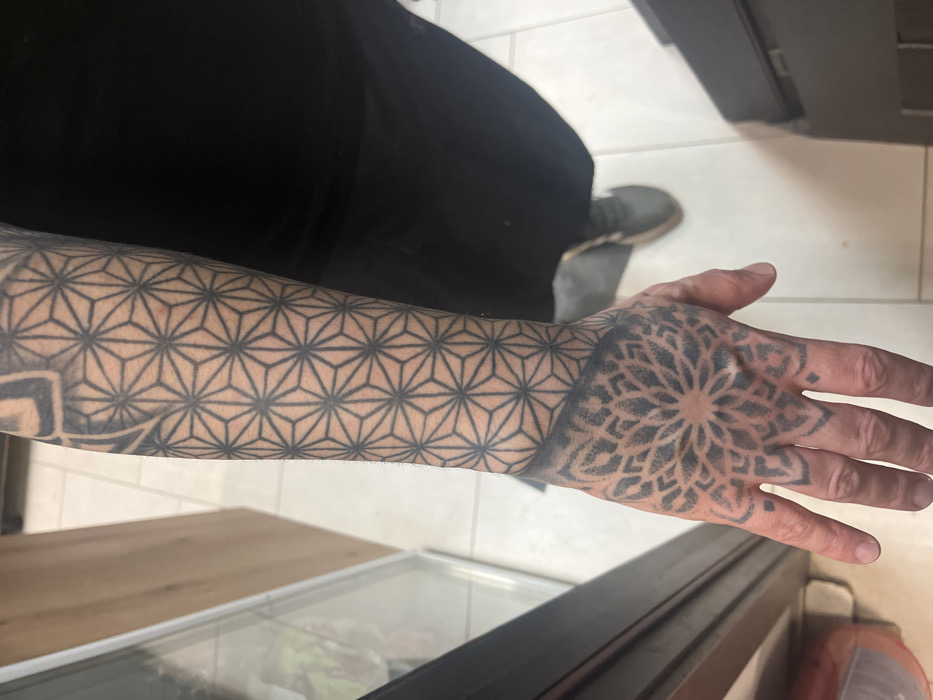 A close-up, downward-angled view captures a person's left arm and hand within an indoor setting in Burgas, Bulgaria. The forearm is extensively covered with a geometric tattoo featuring a repeating pattern of tessellating six-pointed stars, formed by dark lines on light skin. This pattern transitions diagonally at the wrist to a large, intricate mandala-style floral tattoo that covers the entire back of the hand and extends onto the proximal phalanges of the fingers. The tattoos are rendered in dark grey or black ink. The individual wears a black garment, visible on the upper right, and partially visible dark-colored athletic footwear on a light-tiled floor. The immediate background shows a light-colored tiled floor with visible grout lines, a partial view of a light wooden-toned panel or door frame on the left, and a dark, possibly metallic or plastic, vertical structure on the lower right.
