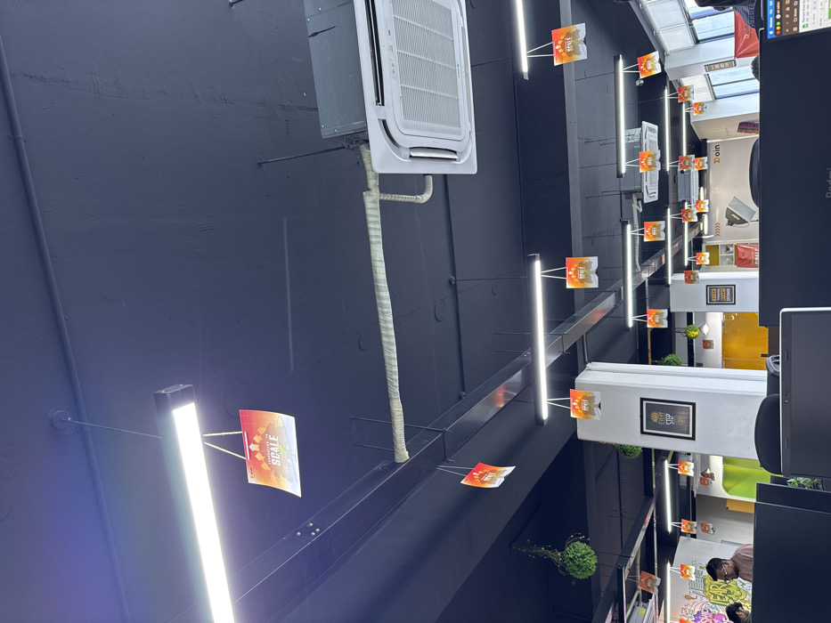 commercial interior space with a dark ceiling structure supporting linear lighting fixtures and a central air conditioning unit. Banners with the text "Journey to Scale" are suspended from the lights. The space below features various retail displays and monitors. There appear to be customers or staff visible in the distance. The overall aesthetic is modern and industrial.