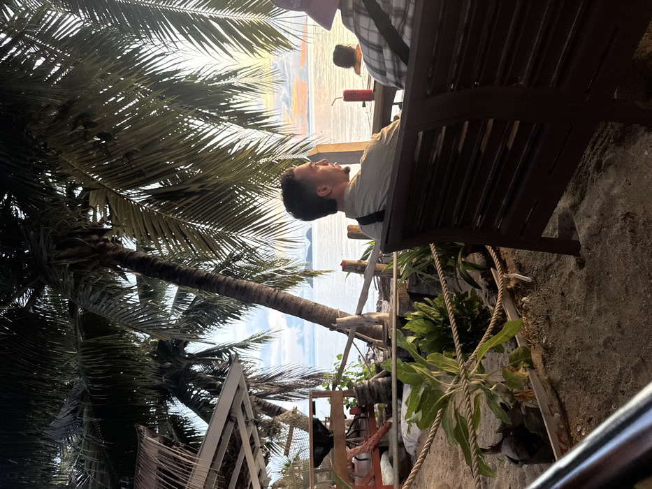 The image displays an outdoor tropical seaside scene at dusk or dawn in Baan Sri Thanu, Thailand. The viewpoint is from a sandy area, looking out towards the ocean. In the foreground, a light-colored twisted rope barrier, supported by rough wooden posts, delineates an area of sandy ground. Behind this barrier, green leafy plants are visible. To the far left, a partial white-colored roof overhang is present, below which a dark, round object rests on a red stand, surrounded by other wooden structures. Two individuals are seated on a dark brown slatted wooden bench, facing the water. The man on the left, viewed in profile, has short dark hair and a beard, wearing a light-colored short-sleeved shirt with dark shoulder straps. He is gazing towards the horizon. To his right, a second person is partially obscured by the first; they wear a light-colored plaid shirt, a purple hat, and a dark shoulder strap. A red branded can with a red straw is positioned on a light-colored table in front of them. The middle ground features the calm ocean, reflecting orange, yellow, and pink hues from the setting or rising sun on the horizon. Several distant landmasses or islands are discernible on the far horizon. A third individual is partially submerged in the ocean, facing away from the camera, silhouetted against the bright horizon. The upper portion of the image is dominated by the fronds and trunks of several large palm trees. The sky above the horizon is a pale blue with some scattered white clouds.