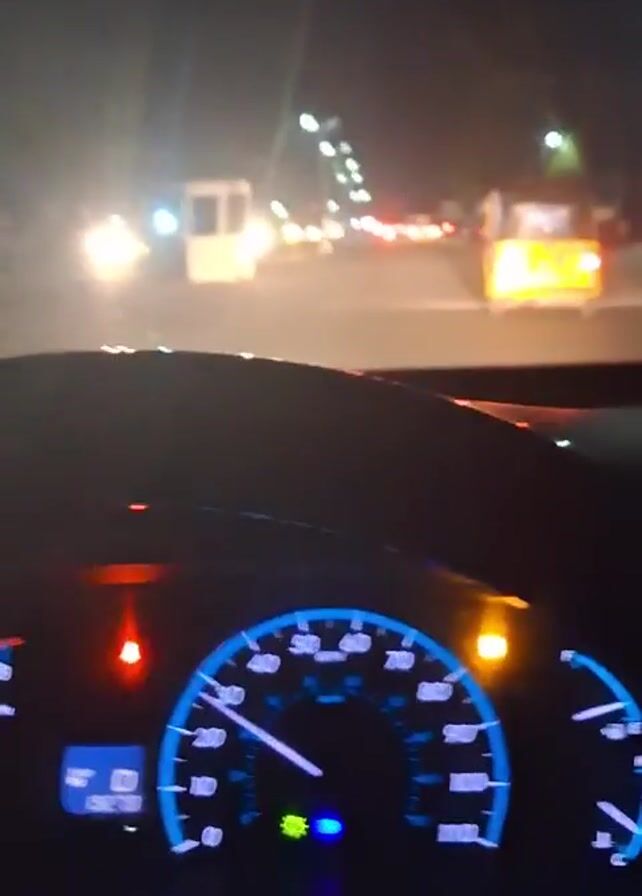 A low-quality video shows a person driving a car at night on a brightly lit road