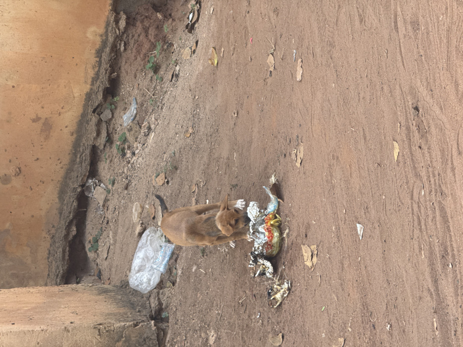The scene, located in Aguata, Nigeria, depicts an outdoor environment with a reddish-brown dirt ground. A light brown, juvenile canine, possessing white markings on its paws and muzzle, stands centrally, its head lowered towards a pile of refuse. This refuse includes crumpled aluminum foil, discarded food remnants displaying red-orange and yellow hues, and a blue wrapper. The dog is actively foraging within this discarded material. The ground surrounding the dog features scattered dry leaves and small pieces of debris. In the background, an upward-sloping dirt embankment is visible, bordered by sections of two worn, light-colored structures, possibly concrete or mud-brick walls, exhibiting discoloration. Additional litter, including a crumpled clear plastic item and small fragments, is present on the embankment, alongside sparse patches of green vegetation.