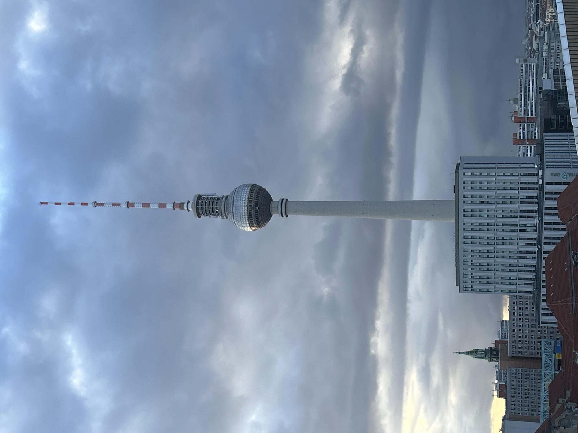 Berlin TV Tower (Fernsehturm) in Berlin, Germany. The tower's distinctive sphere is visible, along with its antenna. The sky is cloudy, and surrounding buildings are visible in the background, providing context for the tower's location in the city. The perspective is from an elevated position.