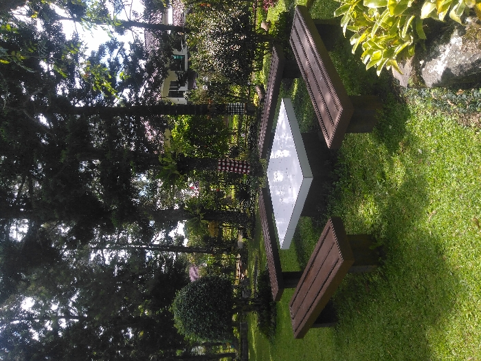The image displays a meticulously maintained outdoor garden scene located in Cipanas, Indonesia, under daylight conditions. Centrally positioned on a verdant grass lawn is a square seating arrangement, consisting of a white-topped square table with a dark base, surrounded by four dark brown, slatted wooden benches symmetrically arranged on each side. The table's surface exhibits a reflective quality. The ground is uniformly covered in green grass, with distinct areas of sunlight and shadow. The background and mid-ground are densely populated with numerous tall, dark green coniferous trees, some of which feature epiphytic growth on their trunks. A specific tree trunk in the mid-right is wrapped with a red and white checkered fabric. Various smaller green shrubs and bushes are interspersed throughout the garden, including a neatly trimmed, rounded shrub on the left. In the upper right portion of the frame, a segment of a white building, possibly a residence or resort structure, with a dark tiled roof and visible windows, is discernible amidst the foliage. No individuals are present in the scene, and no specific actions or interactions are depicted.