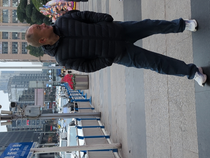 A man stands outdoors, clad in a black puffer jacket and dark trousers, with white sneakers. He gazes upward, his body angled to the right. The background reveals a bustling city scene: a row of parked cars separated by blue metal railings, buildings stretching into the distance, and decorative floral arrangements. Traffic lights and signage are also visible. The sidewalk is gray and made of pavement stones.