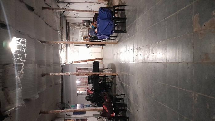 interior of a building located at latitude: -34.667, longitude: -58.733 in the city of Merlo, Argentina. The room is sparsely furnished, featuring a large black piano covered in a red sheet. There is a row of chairs on the left, with another set of chairs on the right, covered in blue sheets. The room has tiled flooring and a high ceiling with a large, cracked, and discolored ceiling. The space appears to be undergoing renovation. There are exposed support beams and a large metal net hanging from the ceiling. The space appears to be an empty event space. The building appears to be in a state of disrepair.