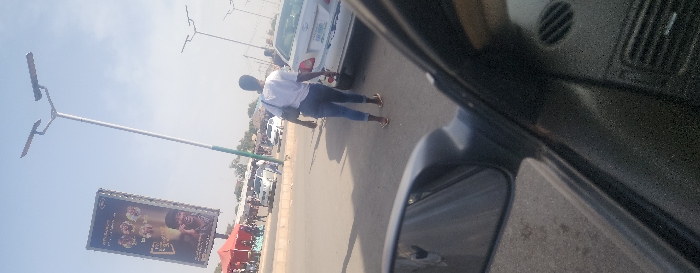 A bright, daytime image captures a bustling street scene in Jos, Nigeria, viewed from the interior of a vehicle. In the immediate foreground, a portion of a dark dashboard and a side rearview mirror are visible. The central human subject, a light-skinned female, is seen from behind, walking on the paved road. She wears a white short-sleeved top, blue jeans, and light-brown sandals, carrying a dark shoulder bag on her left side. To her right, a silver sedan, likely a Toyota model, is either stationary or moving slowly. Its rear license plate, displaying "FG-EKY-698", is legible. In the background, to the left, a large vertical billboard exhibits advertisements featuring multiple faces and partially visible text, including the word "big". Beneath the billboard, a lively market area is visible, characterized by red awnings, numerous indistinct figures, and several parked vehicles, indicating significant commercial activity. A tall, light-grey street light pole with two dark solar panels and light fixtures stands prominently near the billboard, extending towards a clear, pale blue sky. Another similar, smaller street light pole is visible further in the background to the right. The asphalt road shows distinct shadows, consistent with strong sunlight. The overall environment is a busy urban thoroughfare within Jos, Nigeria.