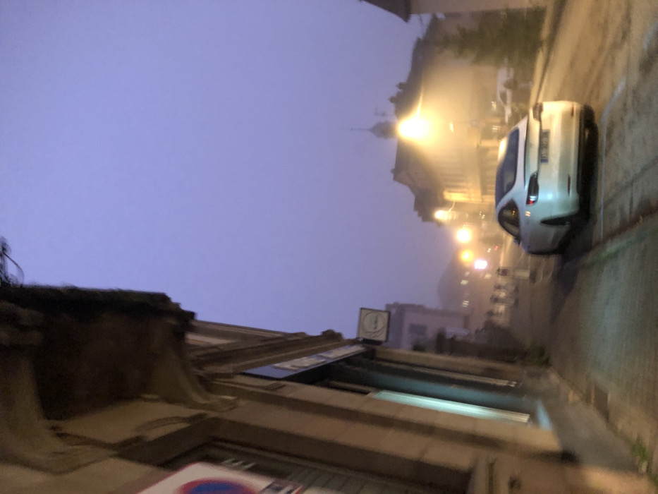 A tilted, hazy urban scene at dusk. A white car is parked on the right side of the frame, next to a wet street. Buildings line the street, illuminated by streetlights that fade into the distance. In the foreground, a building with signage is visible. The sky is a muted purplish-blue, suggesting a late evening or early morning setting. The overall atmosphere is foggy and somewhat indistinct.