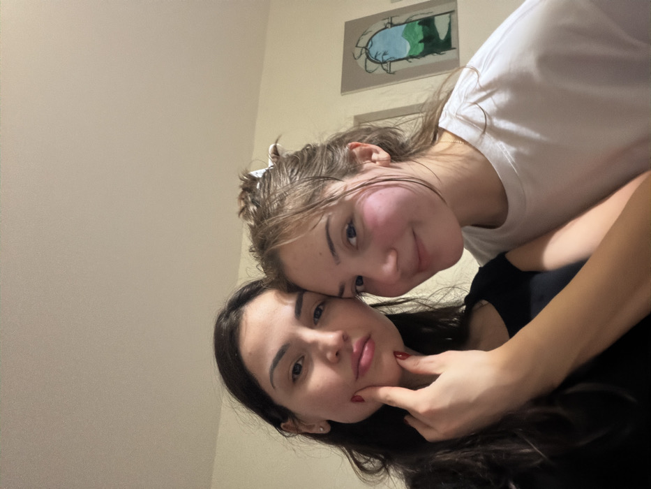 Two young women pose for a photo. The woman in the foreground has dark hair and is wearing a black top. One hand holds her chin. The woman behind her has light brown hair pulled up with a white clip and wears a white t-shirt. An abstract painting of an archway with blue and green hues hangs on the wall behind them. The overall image has a slightly tilted perspective.