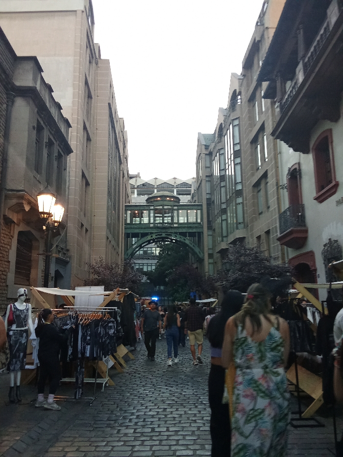 This image depicts an active open-air market occupying a cobbled pedestrian passage in the Lastarria neighborhood of Santiago, Chile, leading towards the Centro Cultural Gabriela Mistral (GAM)