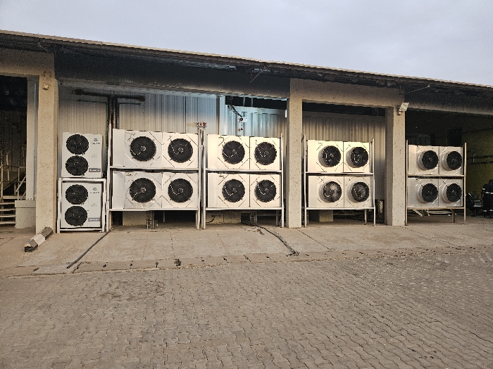 A row of commercial air conditioning units lines the exterior of a building. The units are stacked, some with four fans in a square arrangement, others with two fans. They sit on metal frames under the building's overhang, spaced between concrete pillars. The building's exterior is light gray, and the ground is paved with a geometric pattern. The sky is overcast, casting a muted light on the scene.