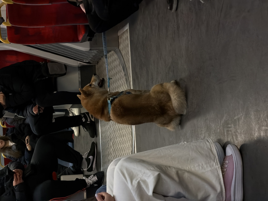 The image depicts the interior of a public transport vehicle, consistent with a metro or train carriage, located within the city of Warsaw, Poland. A light brown Shiba Inu dog, wearing a light blue harness with a matching leash extending forward, is seated squarely on the dark grey, textured floor, facing right with its mouth slightly ajar. Its tail is curled over its back. Multiple human passengers are visible in the mid-ground and background, predominantly seated. On the immediate left, the lower legs of a person are visible, wearing light-colored wide-leg trousers and pink platform sneakers with white soles. To the left behind the dog, a person is seated, wearing black track pants with white side stripes and black Nike sneakers, holding a smartphone. Directly behind the dog, another person is seated, wearing dark trousers and black Nike sneakers, also holding a smartphone; their face is partially obscured by a dark mask. Further back, a person with dark hair is seated, looking towards the right. The vehicle's interior features rows of red upholstered seats with grey frames. The floor is dark grey and shows signs of wear. Light-colored vertical and horizontal panels form the internal structure of the carriage. Artificial lighting illuminates the scene, casting subtle shadows. No direct interaction between the dog and the visible passengers is actively captured.