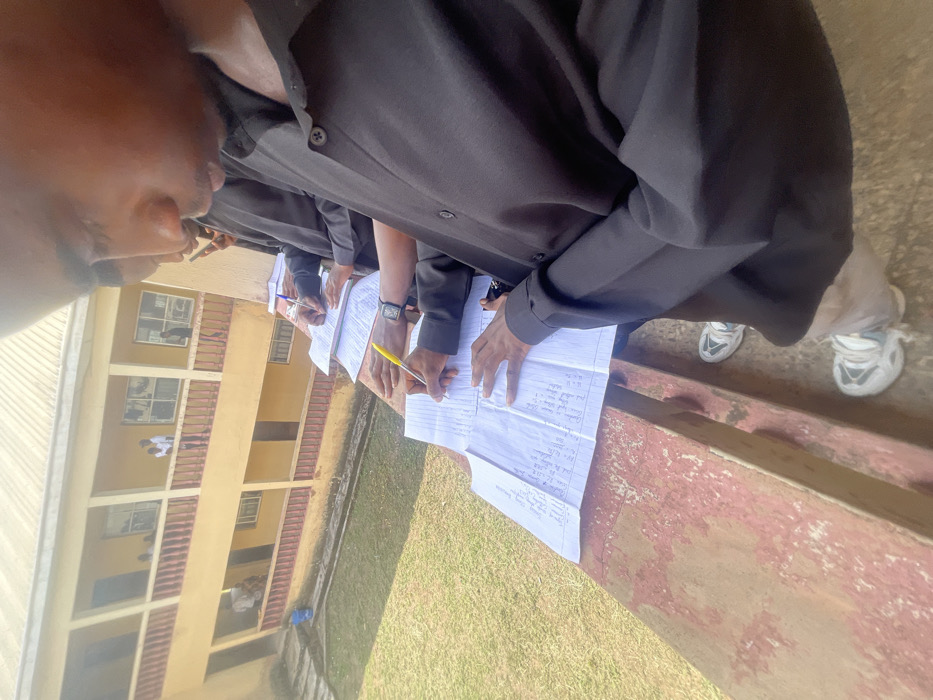 The image depicts an outdoor scene in Okigwe, Nigeria, focusing on multiple individuals engaged in writing activities on a balcony