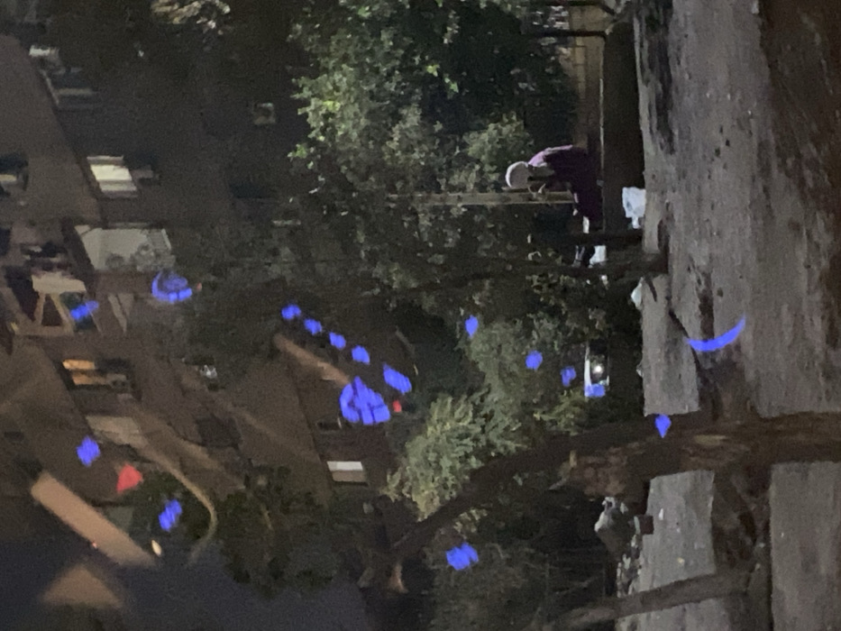 The image depicts a nighttime urban scene in Rukn ad-Din Municipality, Syria. In the mid-ground, a single individual is seated on a low, raised concrete platform. The person wears a light-colored head covering and a dark, long garment, appearing to look downward with their right hand positioned near their face. A white object, consistent with debris, rests on the ground near the individual. The immediate foreground features unpaved earth and several trees with visible branches and foliage. A multi-story residential building occupies the background, displaying multiple illuminated windows, visible balconies, and exterior air conditioning units. A vehicle with active lights is partially obscured by trees in the mid-ground. Numerous blue light aberrations, appearing as streaks, rectangles, and circular patterns, are present across the image, overlaid on the building facade, trees, and ground.