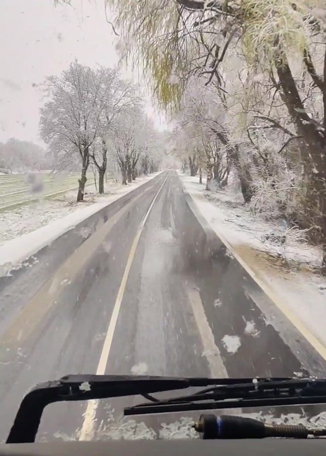 The video, taken from the interior of a vehicle, possibly a truck, shows a snowy road. Snow is falling, and the trees lining the road are coated in snow. The road itself is mostly clear of snow, with some wet patches visible. The windshield wipers are in operation, clearing snow from the glass. There are yellow lines marking the lanes on the road. In the distance, a green field can be seen on the left side of the road.