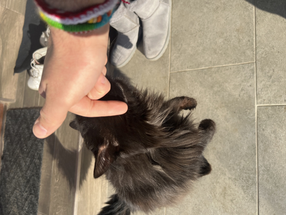 The scene depicts an outdoor interaction in Kazanlak, Bulgaria, under direct sunlight. A small, fluffy black cat is positioned on a light gray tiled surface. Its head is tilted upwards as a human's right index finger gently touches the area above its nose or mouth. The human's wrist wears a multicolored woven bracelet with visible red, green, yellow, and blue segments. To the right, two light gray, slip-on shoes are visible. In the upper left background, a dark gray textured doormat rests partially on a wooden threshold. Strong, defined shadows are cast on the tiles by the hand, cat, and shoes, indicating bright illumination from the left.