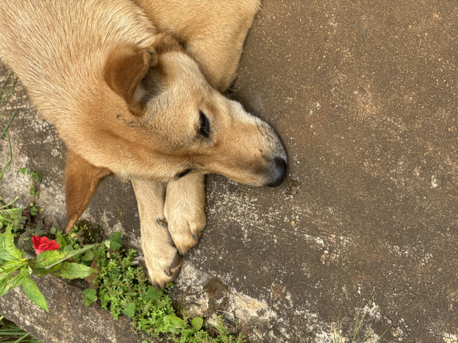 A golden-brown dog rests on a concrete surface, its head turned to the side with closed eyes. The dog's front paws are crossed. To the left, green foliage with a small red flower grows near the edge of the concrete. The concrete itself shows a textured surface with varying shades of brown and hints of white. A small puddle is visible near the dog's nose. The scene is lit naturally.