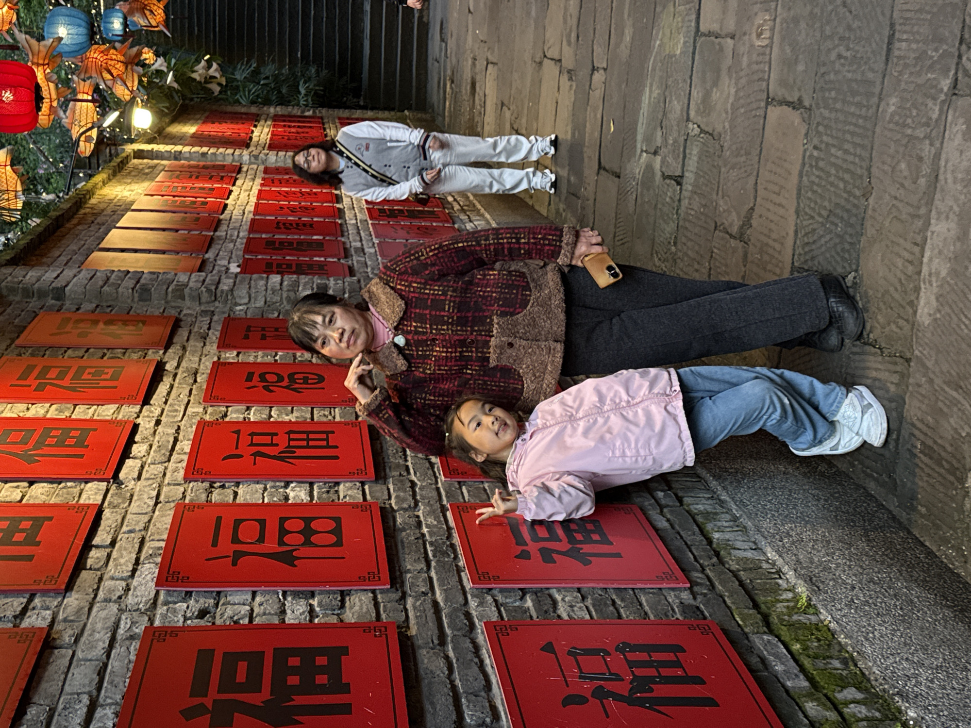 The image displays an outdoor paved alleyway or narrow street situated in Nan'an District, China. A dark grey stone wall on the left is densely covered with numerous rectangular red plaques, each featuring the black Chinese character "福" (fú) and decorative black borders. Moss is visible along the base of this wall. Overhead, a variety of illuminated lanterns are suspended, including red spherical lanterns, blue spherical lanterns, and gold-colored fish-shaped lanterns. An artificial light fixture is affixed to the wall. The ground is paved with irregular, worn stone flagstones. Three East Asian individuals are present. In the immediate foreground, slightly right of center, an adult female with dark hair, wearing a brown and red plaid jacket with a fuzzy brown collar and trim, and dark grey trousers, stands facing the camera. Her left hand is raised near her face, and her right hand holds a light brown smartphone. To her left, a young girl, approximately 5-8 years old, leans against the stone wall. She wears a light pink hooded jacket and blue jeans and is making a peace sign with her right hand, looking towards the camera. Further back on the right, a second adult female, wearing eyeglasses, a grey and white letterman-style jacket, and white trousers, stands facing partially left. A dark strap is visible across her chest, and her hands are clasped loosely in front of her. A dark stone staircase ascends in the right background.