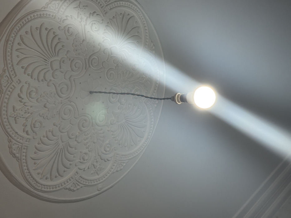 This image depicts an interior ceiling detail in Fez, Morocco. A single, illuminated light bulb with a white spherical casing is suspended by a dark, twisted electrical cord from the center of a circular, ornate plaster ceiling medallion. The medallion, rendered in white, features intricate raised and recessed floral and scroll patterns. The surrounding ceiling and visible upper wall sections are painted a light grey. A distinct, diagonal beam of natural light, likely sunlight, traverses the scene from the upper right, intersecting with the light from the bulb. No individuals or other objects are present in the frame.