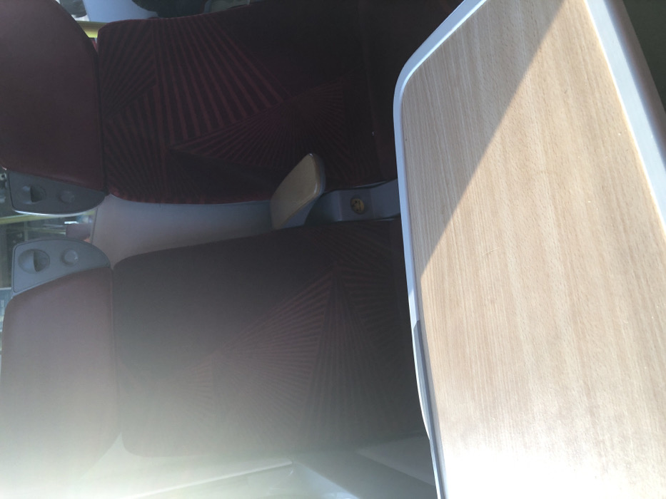 The image depicts the interior of a passenger transport vehicle, likely a train or bus. The specific location within Dettwiller, France, cannot be determined from the visual information provided. In the foreground, a light-colored, wood-grain pattern tray table is visible, extending across the lower portion of the frame. Its left side is brightly illuminated by direct sunlight, which also causes significant lens flare in the upper left quadrant. The table features a light grey or white border. Beyond the tray table, two high-backed passenger seats are positioned in a row. Both seats are upholstered in a dark red or maroon fabric with a subtle geometric pattern composed of radiating lines or stripes. The headrests are solid dark red. The left seat is largely obscured by intense sunlight and lens flare. The right seat shows more detail, including a beige-topped armrest with a grey base located between the two visible seats. Behind the headrests, light grey panels with circular elements, possibly controls or speaker grilles, are faintly discernible. No individuals are present in the scene, and no specific actions or interactions are depicted. The environment is clearly an interior space designed for passenger travel.