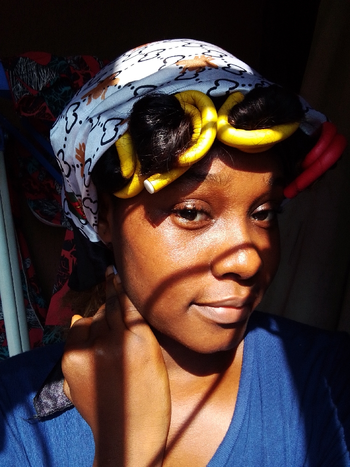 A close-up portrait features an individual with dark skin, likely female, captured in an indoor setting with strong directional lighting. The subject's head is wrapped in a light-colored headscarf patterned with repeating dark shapes resembling a stylized "G" and light brown abstract elements. Several bright yellow and one partially visible red flexible foam hair rollers are present in the hair beneath the scarf, framing the forehead and temples. The individual has dark eyes, a prominent nose, and exhibits a slight, closed-mouth smile. Striped shadows, indicative of light passing through a slatted opening, fall across the right side of the face and neck, contrasting with the more evenly lit left side. The right hand is positioned with fingers resting along the jawline and neck. The subject wears a blue, possibly textured, upper garment. The background is largely dark and out of focus, with hints of colorful fabric and a light-colored vertical object discernible on the left. The image contains no specific visual cues to identify its precise location within the city of Onitsha, Nigeria.