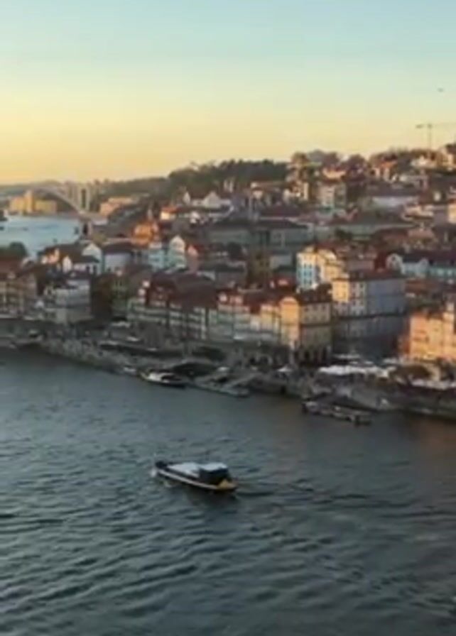 The video showcases a scenic view of a river flowing through a city at dusk