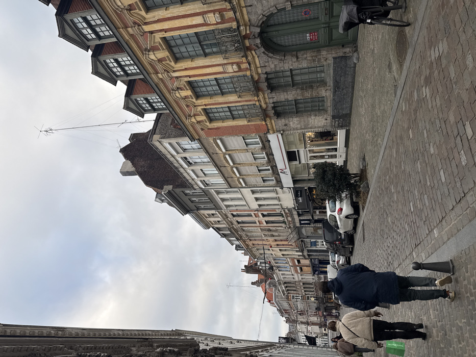 A European street scene features old buildings lining a cobblestone road. People walk along the sidewalk. Cars are parked along the street. The architecture of the buildings is ornate, with many windows. The sky is overcast, and a tall mast rises from one of the buildings. The image is taken from a slightly low angle, emphasizing the height of the buildings.