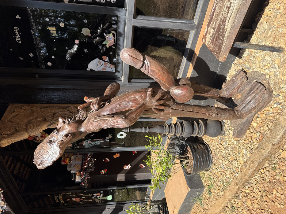 A wooden statue of a man is lying on a surface with his legs outstretched. The statue's head faces left, and the man is holding something in his hands. A large phallus extends upwards from the statue's groin. The statue is positioned next to a building with windows decorated with Christmas-themed stickers. A potted plant sits near the base of the statue. A wooden bench and gravel ground are also visible in the background.