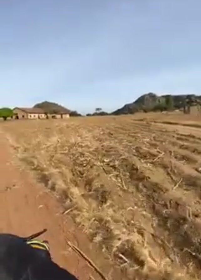 person driving a motorbike on a dirt road through a field. The field is dry and there are some buildings and hills in the distance. The person is wearing sunglasses and a black jacket. The sun is shining brightly.