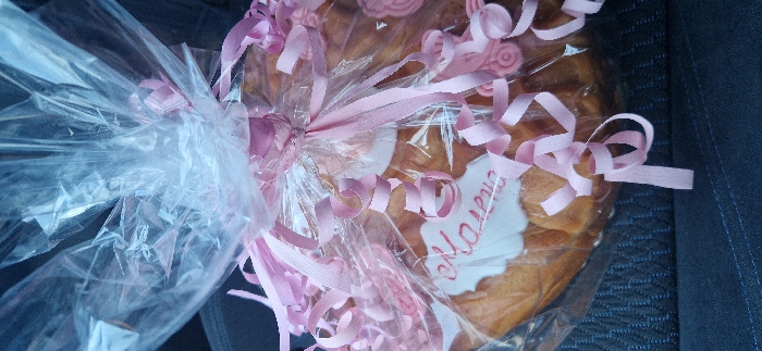 A round, golden-brown baked item, consistent with a cake or bread, is centrally depicted. It is enclosed within clear, crinkled plastic wrapping, secured at the top with a pink satin ribbon tied into a bow. Numerous pink curling ribbons are interwoven around the upper portion of the package. A white, irregular-shaped plaque, likely made of fondant or icing, is affixed to the visible surface of the baked item, bearing the name "Калина" (Kalina) inscribed in red Cyrillic script. Additional small, pink, molded fondant decorations, including elements resembling baby carriages, are present on the item beneath the plastic. The packaged item rests on a dark, textured fabric surface with a discernible woven pattern, consistent with vehicle upholstery. The background is dark and indistinct, indicating an interior setting. The precise location within the city of Kyustendil, Bulgaria, cannot be determined from the visual evidence provided.