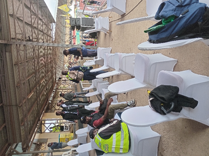 The image depicts a partially occupied grandstand within Kinoru Stadium in Meru, Kenya. The grandstand features a corrugated metal roof supported by metal trusses and beams, with a concrete floor. Numerous white fabric-covered chairs are arranged in rows, facing a stadium field visible beyond a white railing. Many chairs are unoccupied; a black jacket is draped over one chair in the foreground, and a blue/black backpack with green items rests on another. In the left foreground, two men are seated. One wears a neon yellow high-visibility vest with text (partially visible as "SWAHILI PROMOTIO") and a black cap. The other is in a maroon shirt, dark pants, and a black cap. In the midground, approximately five to seven men are standing and walking. One man in a dark jacket is walking right, while another with a light-colored backpack walks away from the camera toward the right. A man in a dark blue polo shirt stands facing this individual near the railing. Another group of men, dressed in casual attire including jackets and caps, stand further back. Black stacked speakers on stands are positioned near the railing, facing the field. In the background, beyond the railing, yellow flags or banners are visible, along with a sparsely populated stadium area and additional individuals. Yellow waste bins are also present in the background. The scene suggests an event is either underway with low attendance or in a preparatory phase, illuminated by natural daylight.