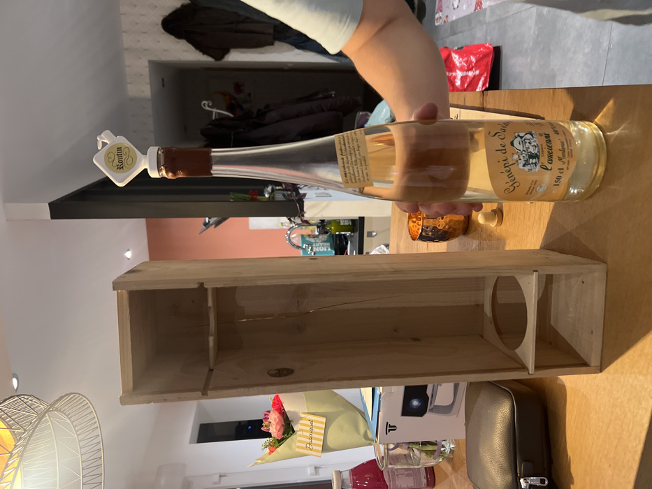 A bottle of "Génépi de Savoie L'anciennel 150 cl Montagne" is held over a wooden box. The bottle has a white cap and is nearly empty. The box is light-colored wood with three compartments, one with a circular cutout. The scene is indoors on a wooden surface. Additional items, including a bouquet, a small projector, and a black bag, are visible on the counter. Clothing hangs in the background.