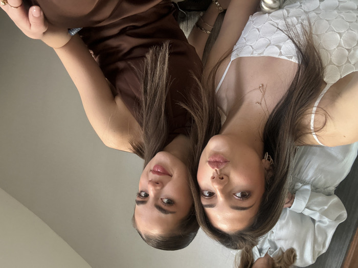 The image depicts three individuals indoors. In the foreground, two young women are positioned closely. The woman on the left has dark brown hair, wears a white strappy top with a circular textured pattern, multiple delicate gold necklaces, and small hoop earrings. She is looking directly towards the camera with her lips pursed in a pout. The woman on the right has dark brown hair pulled back from her face on one side and wears a brown halter-neck garment with a satin-like sheen. She is looking towards the camera with a slight smile. Her right hand, adorned with a ring, is visible. Partially visible in the upper background, a third person, likely a woman, is wearing a light blue or mint green long-sleeved collared shirt and matching pants. The background consists of a plain light gray or beige wall, with a sloped ceiling section visible on the upper right, indicative of an attic or a room with angled architecture. The lighting is even and soft. The specific city location, including Monterrey, Mexico, cannot be determined from the visual information provided within the image.