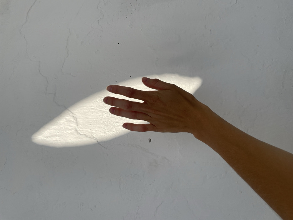The scene, located in Varvarovka, Russia, depicts a human left hand and forearm extended diagonally upwards from the lower left towards the upper right. The hand is positioned against a white, textured wall, characterized by minor surface imperfections and hairline cracks. A bright, elongated, and irregular patch of direct sunlight illuminates a portion of the wall, extending vertically from the top-center downwards. The fingers of the hand are partially within this sunlit area, with the palm and lower arm in shadow. No other subjects or objects are discernible.