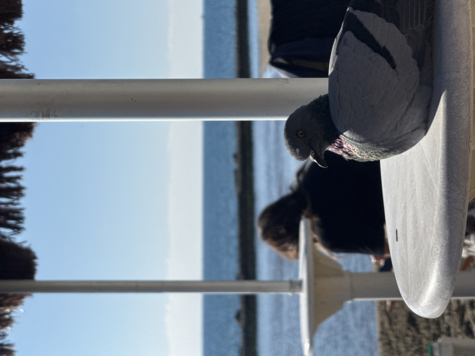 The scene depicts a sunny outdoor area, likely a beachside cafe or restaurant, located in Anzio, Italy. In the foreground, a rock pigeon with grey plumage, a dark head, and iridescent green and purple neck feathers is resting on a light grey, round table. The pigeon is positioned to the right of the frame, facing right, with its body angled slightly towards the viewer. To the immediate left of the table, a white container is partially visible. Two white vertical poles, presumably part of an outdoor seating structure with a thatched roof partially visible at the top, ascend through the frame. In the midground, behind the foreground table and the left pole, a person with long, dark hair, wearing a dark top, is seated with their back to the camera, looking towards the sea. Another light-colored table is positioned in front of this person. To the right of the person, behind the right pole, a dark item, possibly clothing, is draped over an unseen object. In the background, a calm blue sea extends to the horizon under a clear blue sky. A dark, linear breakwater or rock formation is visible across the mid-distance of the water. The ground beneath the seating area appears to be sandy or pebbly beach terrain.