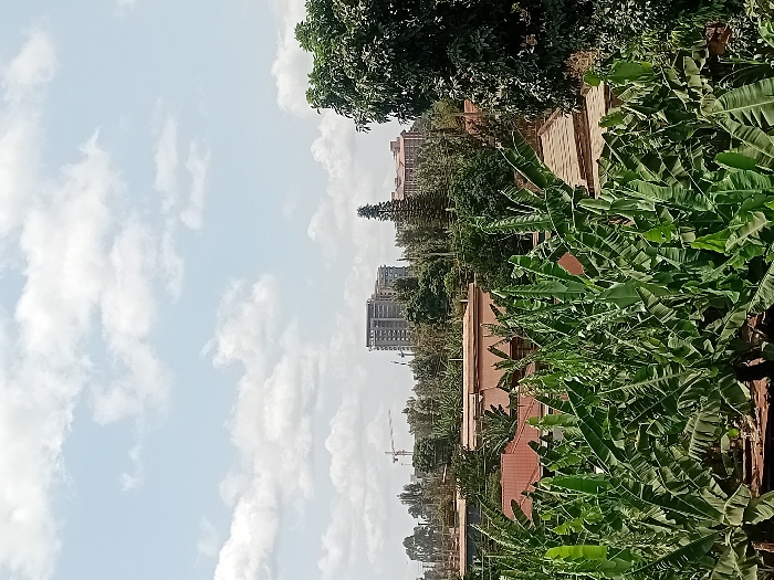 This image presents an elevated, static view of a landscape within Karingani ward, Kenya, during daylight hours under a partly cloudy sky. The foreground is filled with a dense array of numerous large-leafed banana plants, several displaying clusters of developing green fruit. To the far right, a section of a dark-foliaged tree is visible. The midground features various low-rise structures with reddish-brown tiled roofs, partially obscured by extensive green tree cover. In the background, a cluster of modern, multi-story buildings, characterized by concrete and glass construction, rises above the tree line. A construction crane is faintly visible on the left side of the distant horizon. The sky is light blue with scattered white cumulus clouds. No individuals, direct actions, or interactions are observable within the frame.
