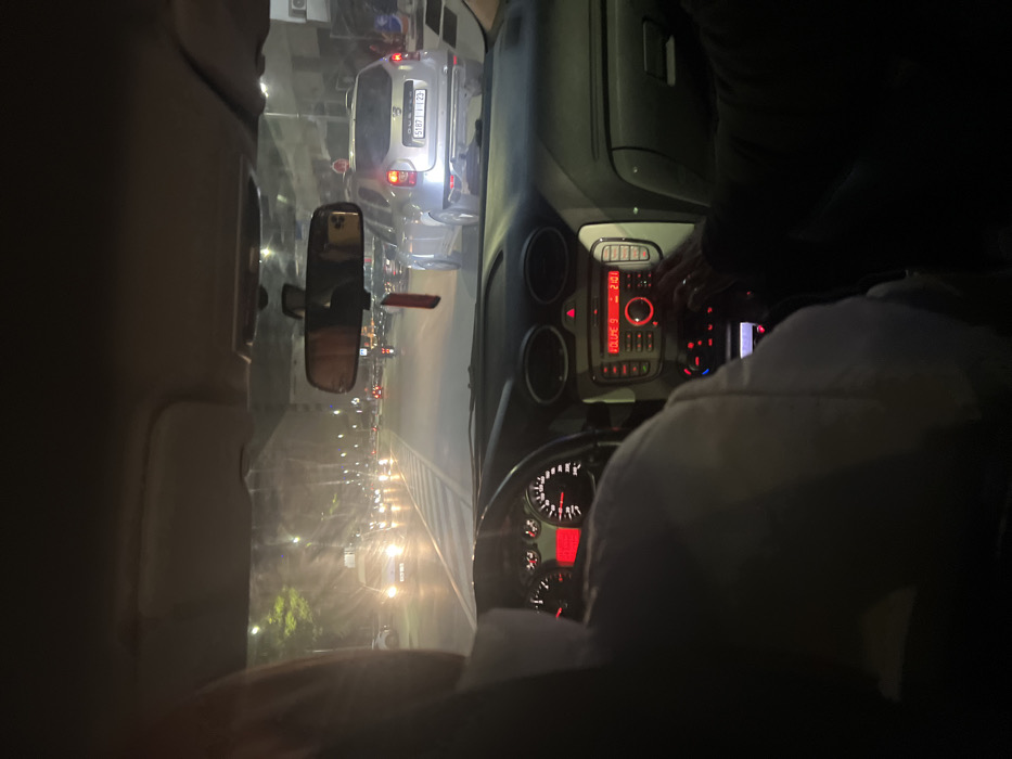 The view from inside a car, likely at night, showcases a dashboard with red illuminated controls