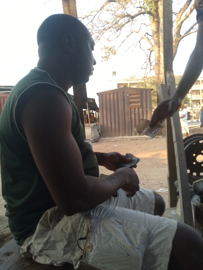 This image captures an outdoor daytime scene in Unknown, Unknown. A dark-skinned male is seated in the foreground, positioned in profile facing right. He wears a dark green sleeveless shirt with white trim and light-colored shorts. His hands are occupied with paper currency and a small, dark rectangular object. Another dark-skinned arm and hand extend into the frame from the right, holding paper currency and a similar small, dark object, indicating an active exchange with the seated individual. The ground is dirt. In the mid-ground, a brown corrugated metal structure with a horizontal slat detail is visible, along with a wooden post and a large, dark circular object on the far right. The background features trees with sparse foliage and a multi-story, light-colored building. Two additional figures are distantly visible in the background. The scene is brightly lit, casting the foreground subjects partially in silhouette.