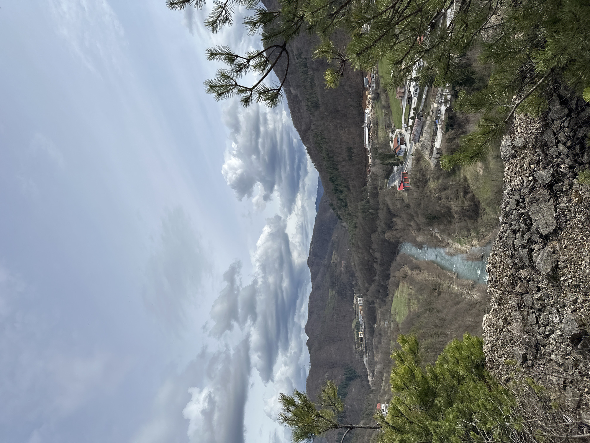 The image captures a scenic view from an elevated position in the city of Srednogortsi, Bulgaria. The foreground features rocky terrain and sparse vegetation, including coniferous trees, suggesting a mountainous or cliffside location. In the midground, a river winds through a valley, flanked by forested hillsides and the built environment of the town. Buildings are visible along the riverbanks and further up the slopes. The background reveals a mountainous range under a sky filled with dynamic cloud formations. The overall impression is one of a natural landscape in close proximity to human development.