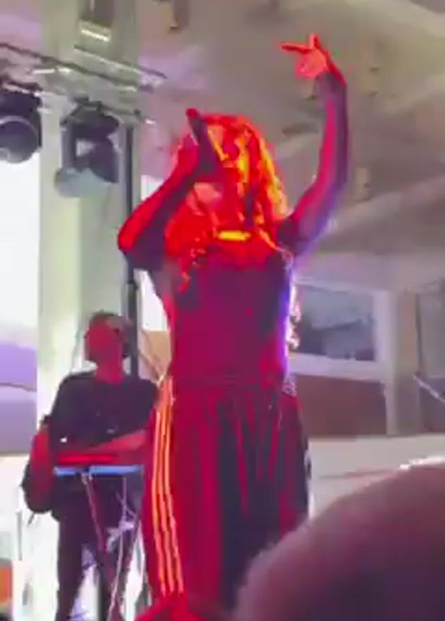 A female singer performs on stage under a red light. She wears a black top and striped pants, and dances while holding a microphone. A musician playing the keyboard stands behind her to the left. The scene appears to be a concert in a club or similar venue. The shot is somewhat obstructed by a crowd in the foreground.